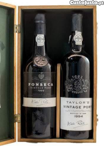 Conjunto Porto Fonseca + Taylors Vintage 1994 (Os 2 melhores Vinhos do Mundo) Porto Vintage 1994 Taylor e Fonseca, garrafas assinadas Os dois vinhos que obtiveram 100 pontos em 1997 pelo Wine Spectator. O Porto Vintage 1994 recebeu 100 pontos do altamente reconhecido James Suckling, que formava parte da equipa da revista Wine Spectator na altura. Foi feita uma edição limitada de 2000 caixas com as duas garrafas assinadas e numeradas sendo esta a n 1959. Raríssima edição completa com a caixa de madeira e a de cartão com que foi editada. Rigorosamente nova sempre mantida em temperatura controlada. "Numa só palavra, fabuloso. O meu Taylors favorito tem sido sempre o 1948, que é ainda hoje estupendo de beber. No entanto, nunca tinha dado 100 pontos a um Taylors até provar o 1994". Pontuação: 100 James Suckling Nome: Porto Fonseca Vintage 1994 Nome: Porto Taylors Vintage 1994 O Estilo: Dos Vintages Fonseca advém do lote dos vinhos das 3 propriedades , todas localizadas no Cimo Corgo: Quinta de Santo António, Quinta do Cruzeiro e Quinta do Panascal. As melhores uvas destas quintas são lotadas com uvas de Outras Quintas que fornecem a Fonseca para produção de vintage clássico. Notas De Prova: Cor negra impenetrável. Clássico nariz. Dominando por exuberante e presenteira fruta, um perfume poderoso denso e escuro a amoras e groselhas, que lentamente libertam uma mistura inebriante de aromas a especiarias e ervas, nota sedutoras de café e cacau, sugestões de ameixa seca e aromas selvagens de esteva. Os taninos que transborda em sabor a amora e groselha, expressos e aveludados dão ao vinho uma densidade voluptuosa.