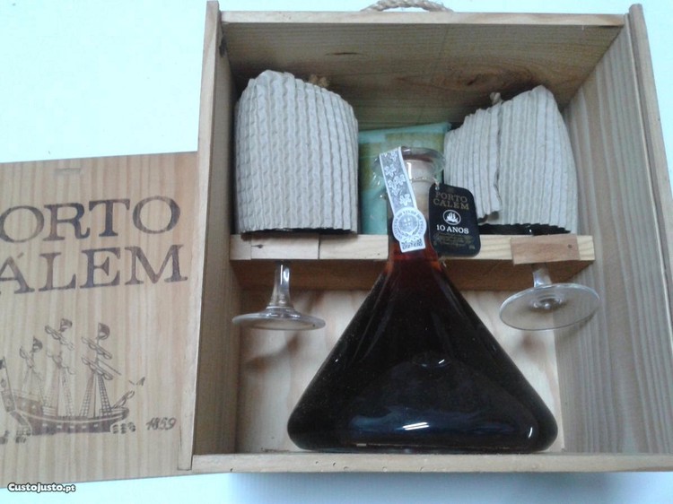 Excelente garrafa decanter de cristal + 2 copos com Cálem 10 anos. Têm rolha de cristal tb para depois de aberta. Engarrafada na década de 80's.