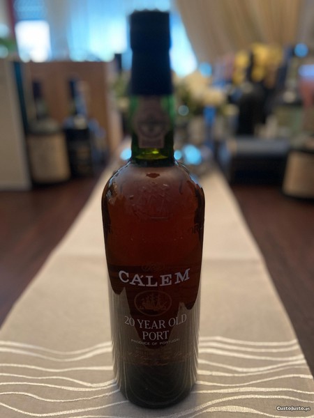Garrafa antiga de Vinho do Porto Tawny 20 anos da marca Cálem com respectiva caixa.