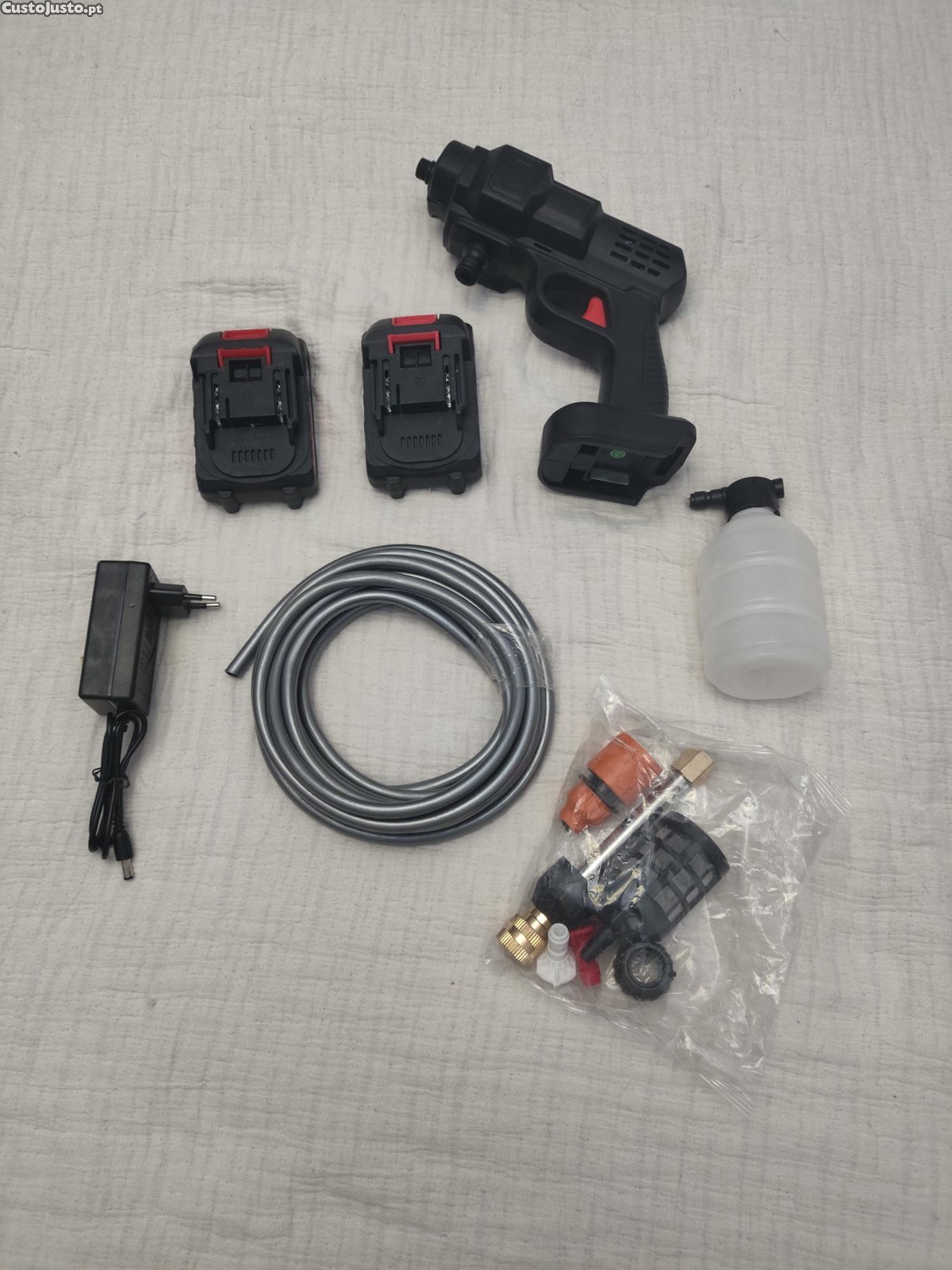 - Conteúdo do Kit: Inclui a pistola, duas baterias recarregáveis, carregador, mangueira e vários bicos de pulverização.