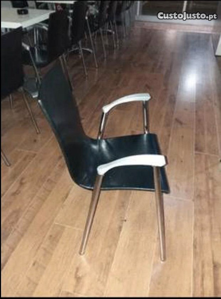 Cadeira de braços, em estrutura em inox, assento em estofo pele preta ( também c/ opção em madeira cerejeira) conforme fotografia.