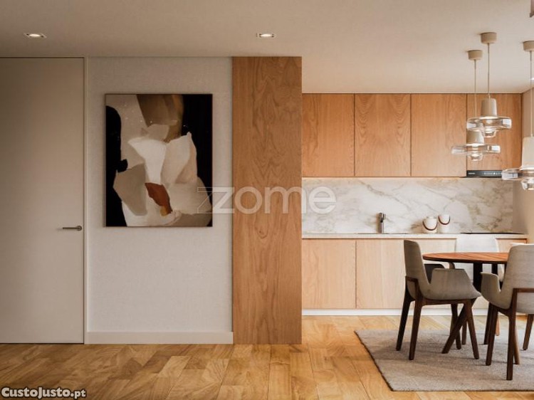 - Pavimentos: Madeira multicamada Kahrs Carvalho Gustaf na sala e quartos, com cerâmicos RECER nas zonas húmidas.