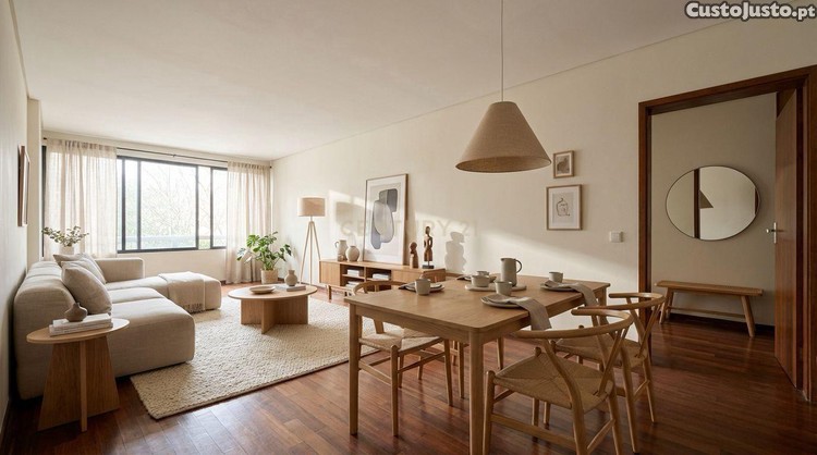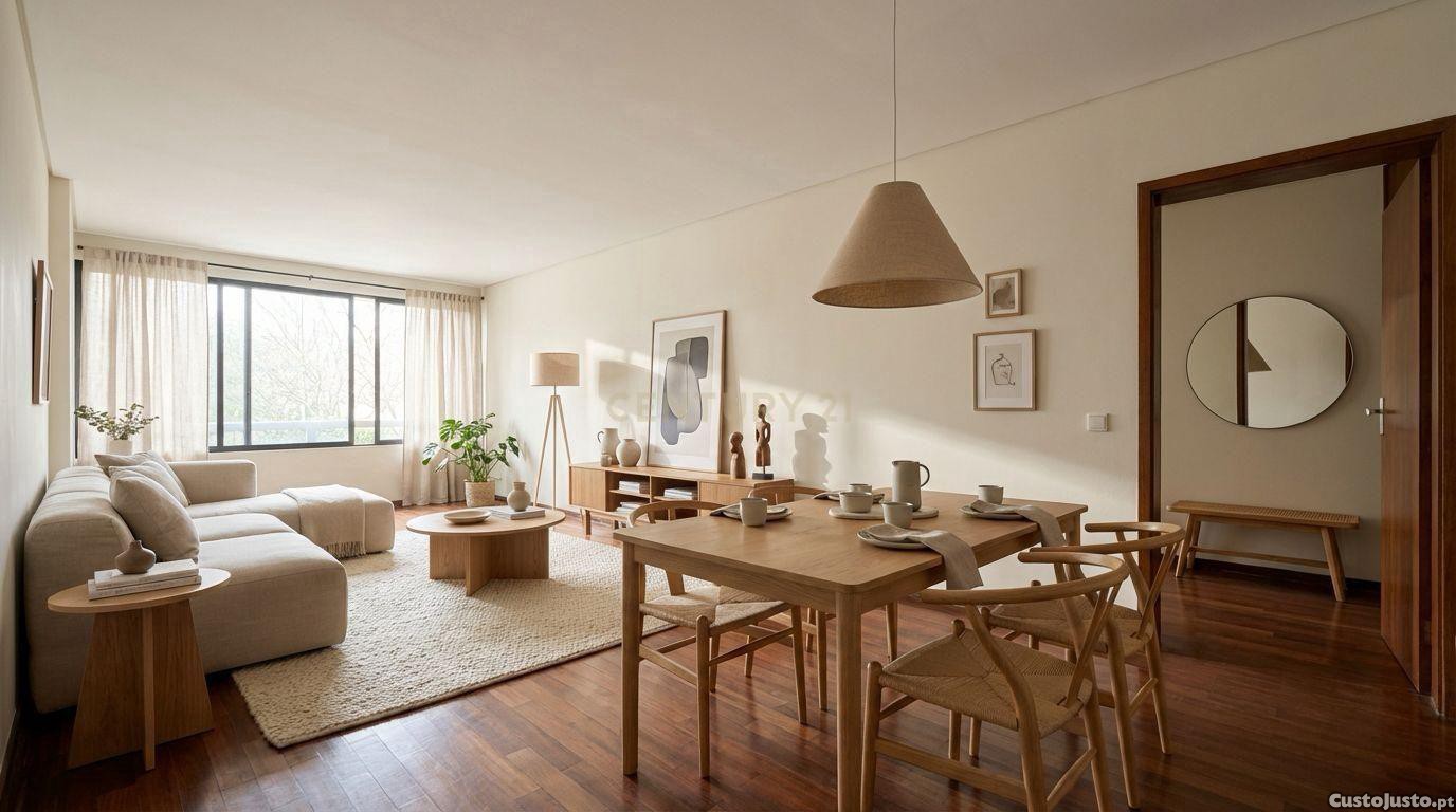 O apartamento apresenta uma distribuição muito equilibrada. A cozinha é apoiada por despensa e lavandaria, oferecendo uma área prática e funcional. A sala comum, com cerca de 30 m², destaca-se pela sua amplitude e potencial de conforto.