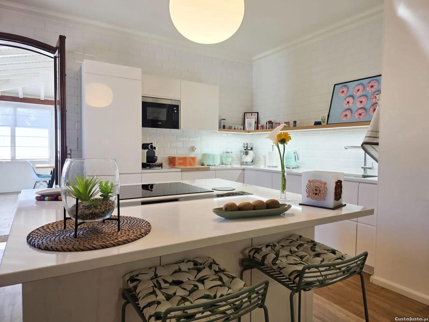 Rés-do-chão: Uma ampla e elegante cozinha com alpendre fechado, perfeita para momentos em família, uma casa de banho de apoio, uma acolhedora biblioteca, sala de estar e uma espaçosa sala de jantar ambientes pensados para o bem-estar e convivência.