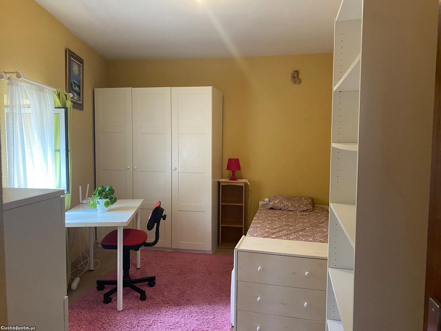 Cada quarto está mobilado e tem chave para maior privacidade; este quarto em específico fica no primeiro andar da casa, e a casa de banho que lhe corresponde é partilhada com a menina do quarto do lado.