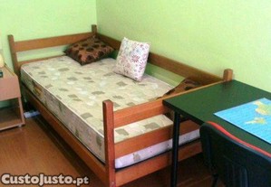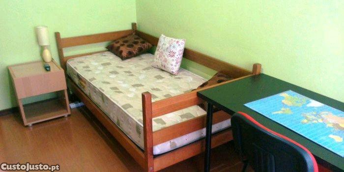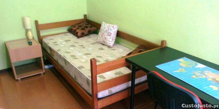 Mobilado: Cama individual, secretária com cadeira, mesa de cabeceira e roupeiro espaçoso.