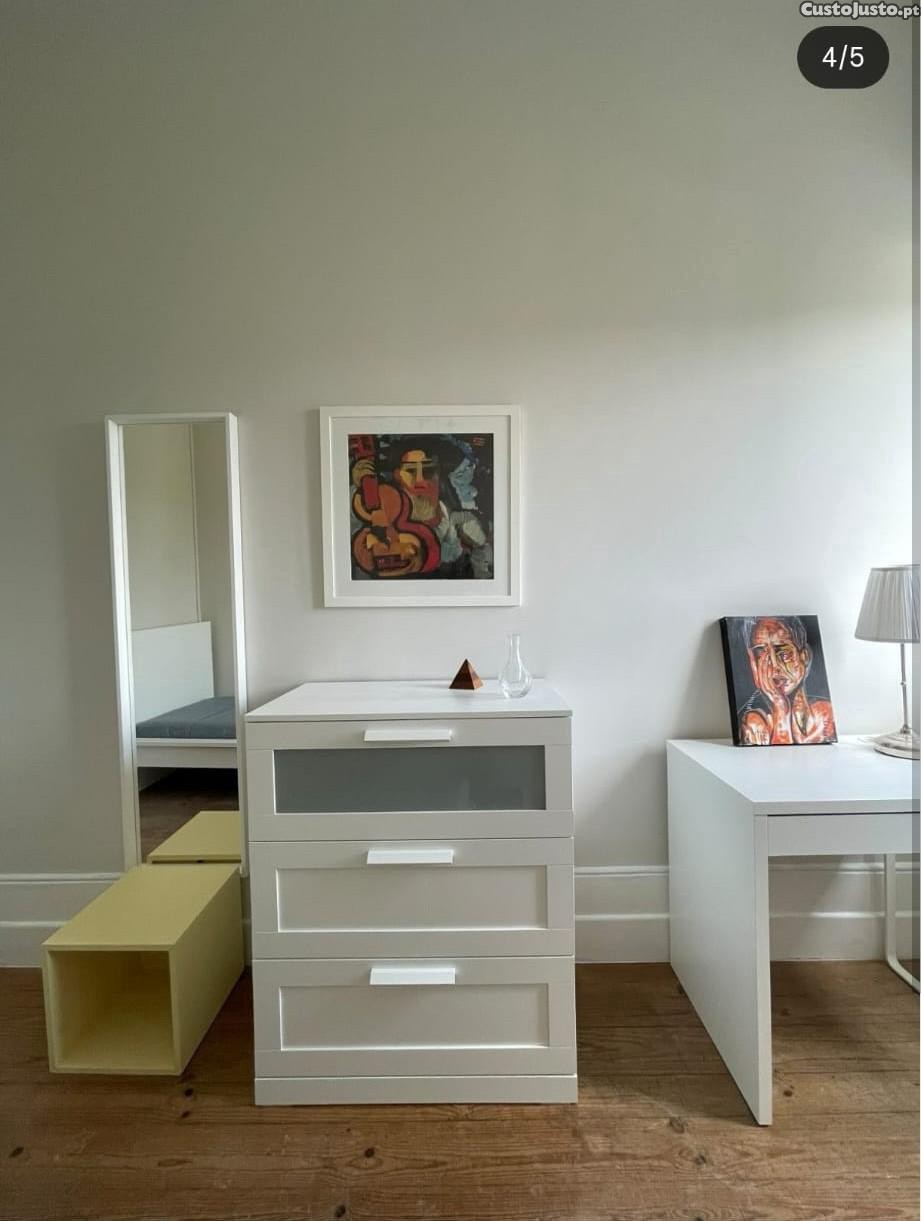 Mobilado com cama de solteiro, secretária, cômoda.
