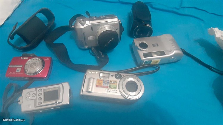 Vendo 6 câmaras fotográficas digitais. A Sony Cyber-Shot 6x zoom funciona bem. AQ Preview1.3 funciona bem.A Olympus U 760 funciona, mas tem algum problema na imagem ou na configuração. A HP não foi experimentada por falta de acessórios. A Olympus Camedia funciona bem, embora lhe falte a parte da frente da lente. A F2 preta está como nova.
