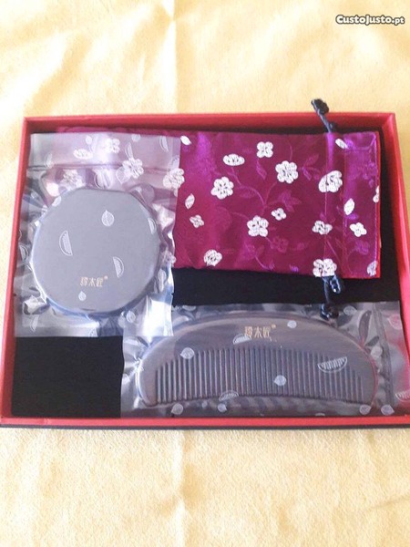 Conjunto pente, espelho e saco óculos