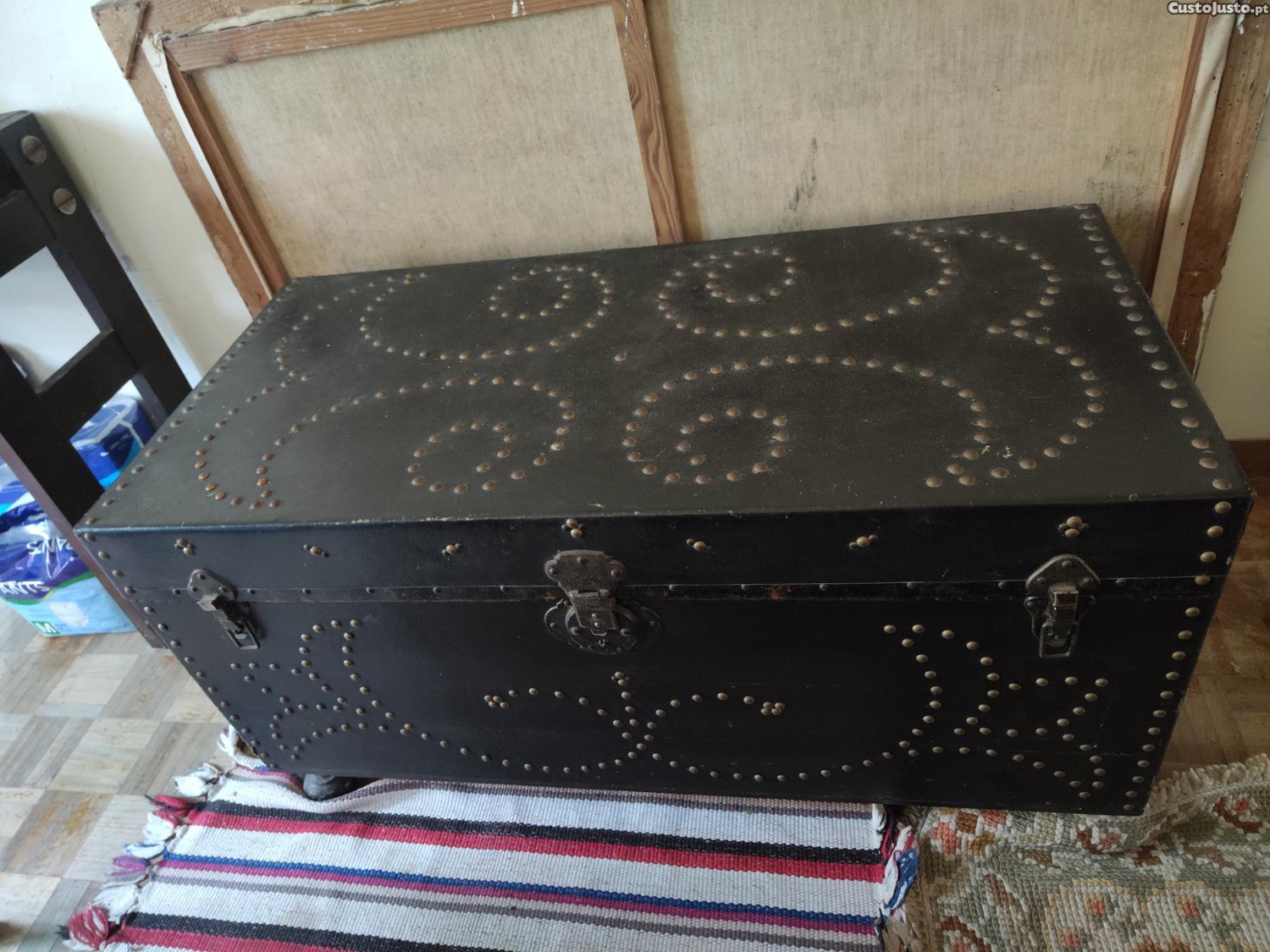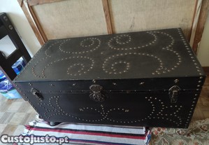 Baú vintage em madeira com detalhes decorativos em metal (tachas).
