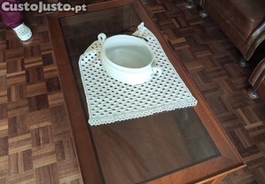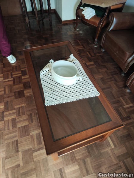 Mesa de centro em madeira com tampo em vidro.