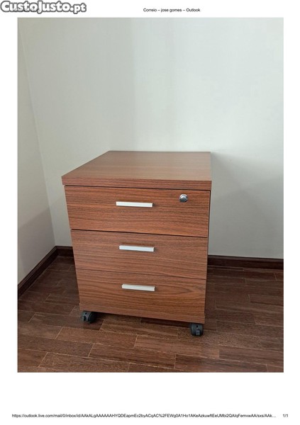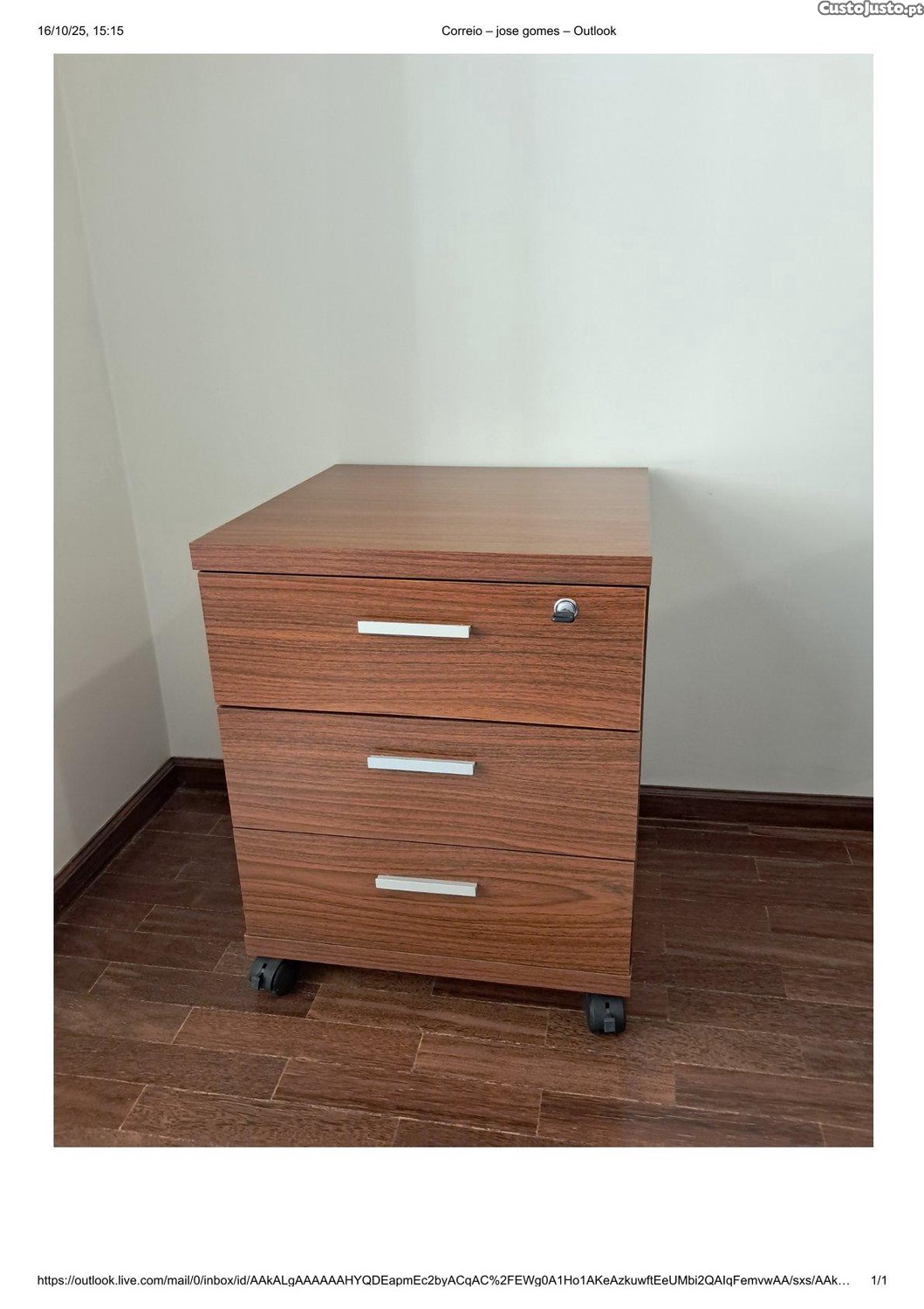 Móvel de apoio em mdf, com revestimento em melamina cor castanho, com 3 gavetas, fechadura central. Pés com rodas com trinco. Pouco uso, muito bom estado (conforme fotos). Medidas: alt. 0,61mt ; larg 0,49mt ; profund. 0,48mt . Entrega no local de venda.