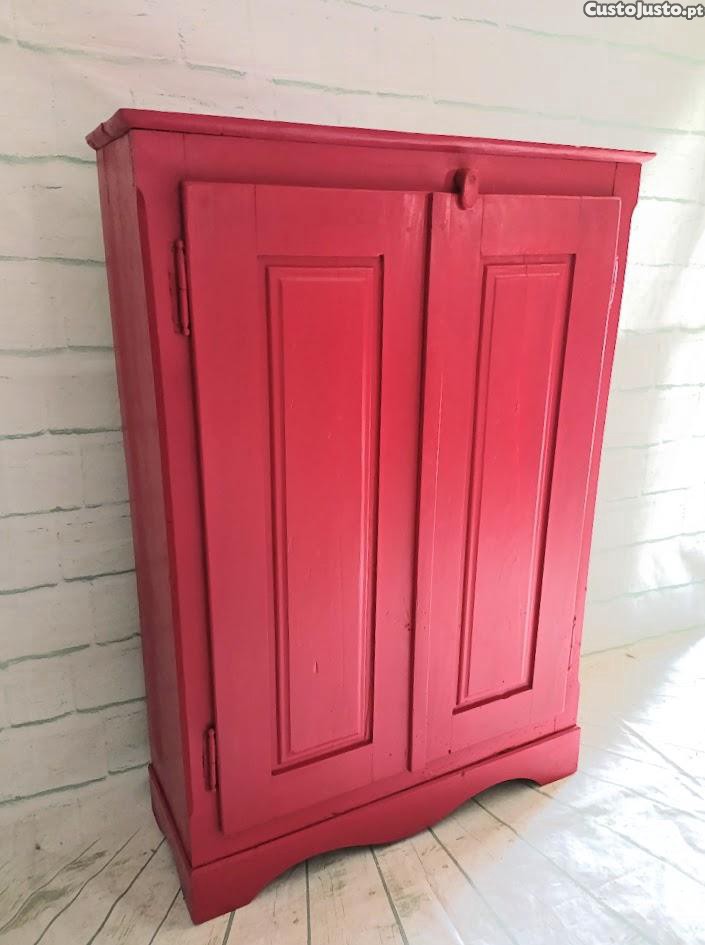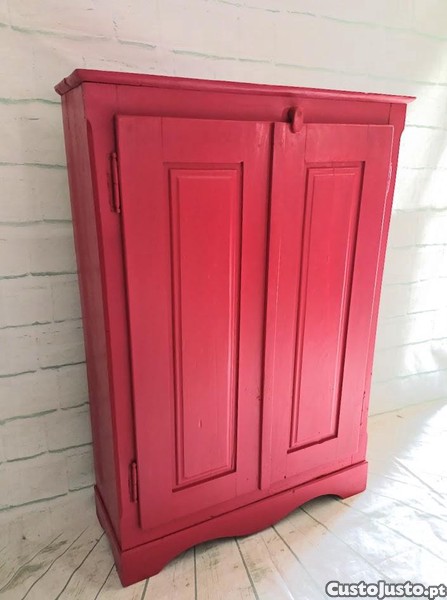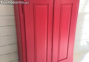 Móvel bar da 1. metade do século XX, com suporte de copos e duas prateleiras, em madeira maciça de pinho nacional, restaurado e personalizado, com pintura em vermelho seco mate.