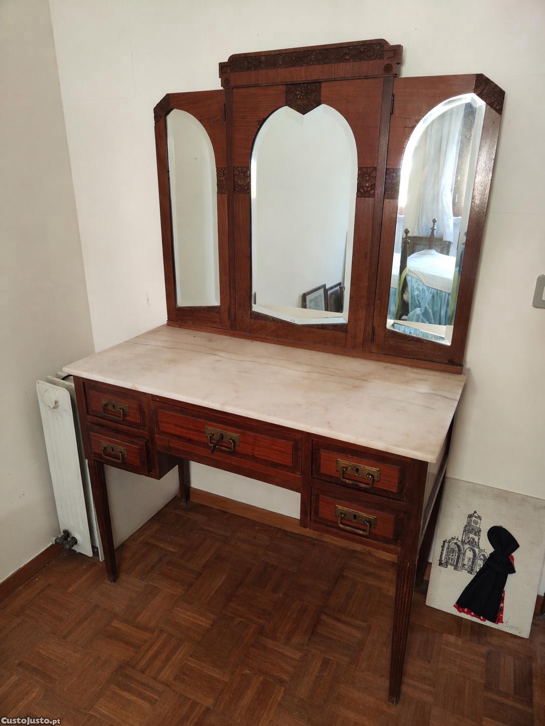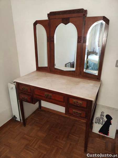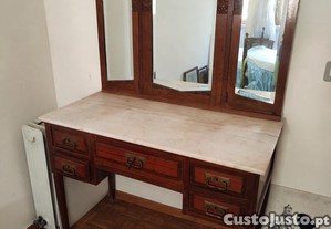 Toucador/penteadeira em madeira maciça com espelho triplo articulado e tampo em mármore.