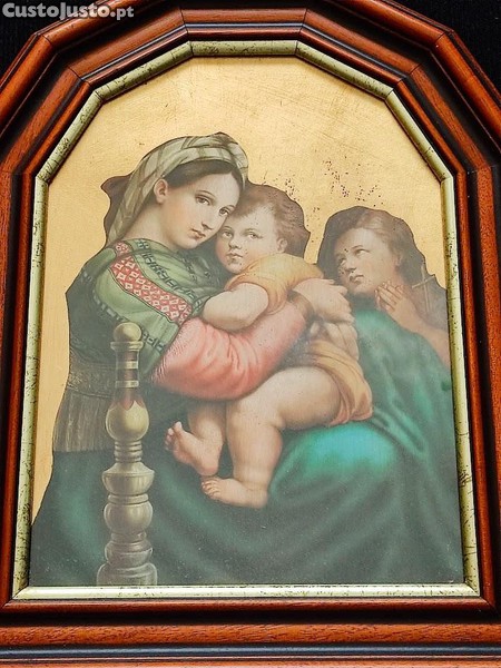 Possibilidade de envio com acréscimo de preço. Quadro com reprodução da pintura de Madonna della seggiola ou Madonna della sedia, pelo artista renascentista italiano Raphael. Retrata Maria abraçando a criança (Cristo), enquanto o jovem João Batista observa devotamente. O original (pintura) está alojado na coleção Palazzo Pitti em Florença. Artigo em excelente estado, com lindíssima moldura em madeira, apresentando vestígios de uso. Pesa 1,780kg. Mede 43cm largura x 53cm altura x 4cm espessura (ver última foto). Veja também os meus outros artigos religiosos anunciados, ateste a minha antiguidade enquanto utilizador registado. Honestidade, seriedade e rapidez nas respostas e entregas/envios.