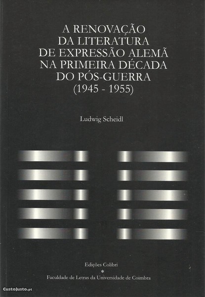 A RENOVAÇÃO DA LITERATURA DE EXPRESSÃO ALEMÃ NA PRIMEIRA DÉCADA DO PÓS-GUERRA (1945-1955). *** Ludwig Scheidl *** Lisboa: Edições Colibri / [Coimbra]: Faculdade de Letras [da Universidade] de Coimbra, 1998. Colecção: Textos Pedagógicos e Didácticos - 7. (23 x 16 cm.) com 118 + [2] pp. Capa flexível. Bom exemplar. Capa e páginas bem conservadas e limpas. *** Primeira edição deste trabalho que procura rastrear as novas tendências renovadoras presentes na literatura de expressão alemã, na década que se seguiu ao fim da Segunda Guerra Mundial. (Índice nas imagens 6 e 7). Tiragem de apenas 400 exemplares. *** Portes: envio gratuito em correio normal (tarifa especial para livros) * envio em correio registado: 1,70