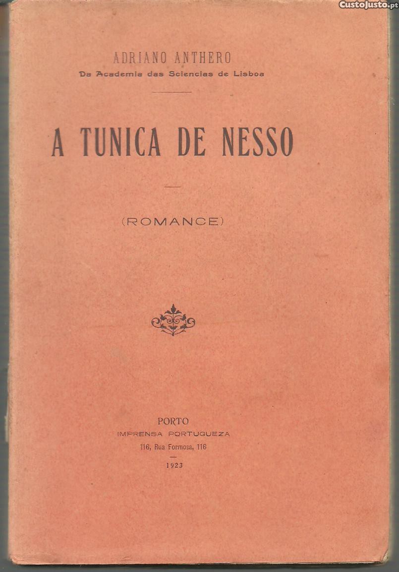 A TUNICA DE NESSO. (Romance). *** Adriano Anthero [Da Academia das Sciencias de Lisboa] *** Porto: Imprensa Portugueza, 1923. (19,5 x 13 cm.) com 228 pp. Capa flexível. Exemplar razoável. Capa com marcas de manuseamento, pequenas manchas, alguns vincos discretos, um pouco descolorida em alguns pontos e algo gasta nas margens e na lombada, que apresentam também alguns pequenos rasgões. Perto da base da lombada tem colada uma etiqueta com um número manuscrito. Globalmente, apesar de um pouco envelhecida, está ainda bastante apresentável. Páginas em bom estado e limpas, embora apresentem um ligeiro amarelecimento e algumas pequenas manchas de acidez (ténues e pouco frequentes), sendo tudo próprio do tipo de papel utilizado. *** Primeira edição deste romance, a que se juntam quatro contos no final, de Adriano Antero, advogado e escritor português, natural de Cárquere, concelho de Resende, e autor de vasta bibliografia, que abrange escritos económicos, políticos, jurídicos, mas também poesia e romance. Não comum. *** Portes: envio gratuito em correio normal (tarifa especial para livros) * envio em correio registado: 1,70