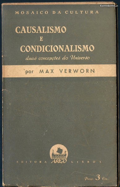 CAUSALISMO E CONDICIONALISMO. *** Max Verworn [Professor da Universidade de Bona] *** Tradução de Mário de Caires *** Lisboa: Editora Argo, 1940. Colecção: Mosaico da Cultura - 13. (19,5 x 12 cm.) com 56 + [8] pp. Capa flexível, com badanas. Exemplar razoável. Capa com marcas de manuseamento, manchas ligeiras, um pouco escurecida e algo gasta na lombada e nas margens, que apresentam mesmo pequenos rasgões e se encontram ligeiramente amachucadas em alguns pontos. Apesar de evidenciar algum uso e envelhecimento, de um modo geral, encontra-se ainda apresentável. Páginas em relativo bom estado, embora apresentem um tom amarelecido, próprio do papel, e algumas manchas de acidez, mais significativas nas primeiras e nas últimas. *** Presumível primeira edição portuguesa desta interessante obra, acerca da qual se lê numa das badanas: Duas coisas estados ou fenómenos podem ter causas iguais. Mas conforme as circunstâncias em que se desenvolvem, em que se nos apresentam ou em que se tornam activas, os seus aspectos ou efeitos podem ser diferentes. O Autor ensina-nos, da maneira mais inteligente, a não explicar as coisas só pelas suas causas, mas sim segundo um conjunto de factores ou «condições, quere dizer: conduz-nos do causalismo ao condicionalismo. *** Portes: envio gratuito em correio normal (tarifa especial para livros) * envio em correio registado: 1,70