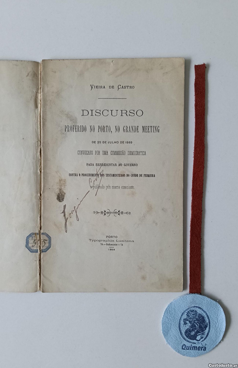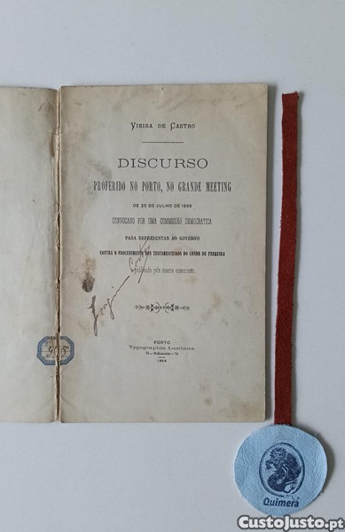 CASTRO (Vieira de). - DISCURSO PROFERIDO NO PORTO, NO GRANDE MEETING, de 25 de Julho de 1869, Convocado por uma comissão democrática para representar ao Governo, contra o procedimento dos testamenteiros do Conde de Ferreira. Porto, Typographia Lusitana, 1869. In-4° 43 pp. Lombada cansada e frágil protegida com fita transparente para conservação.