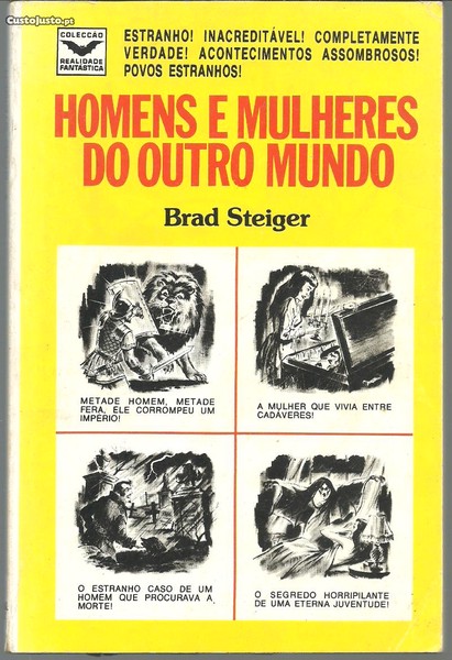 HOMENS E MULHERES DO OUTRO MUNDO. *** Brad Steiger *** Tradução de Clara d'Oli *** Título original: «Strange Men and Woman *** Lisboa: Edições Portugal Press, 1979. Colecção Realidade Fantástica - 4. (21 x 14 cm.) com 144 pp. Capa flexível. Exemplar razoável. Capa com marcas de manuseamento, manchas ligeiras, pequenos vincos e um pouco gasta nas margens e na lombada, que se encontra também algo descolorida e tem um pequeno rasgão na base (pouco importante). Apesar de um pouco envelhecida, de um modo geral, está ainda bastante apresentável. Páginas em bom estado e limpas, embora apresentem um tom ligeiramente amarelecido e algumas pequenas manchas de acidez (pouco frequentes, incidindo quase só nas margens das primeiras e das últimas e nos cortes). Uma folha apresenta um rasgão e a falta de um pedaço de papel na base (provavelmente por ter sido aberta de maneira descuidada), mas que não prejudica a parte impressa. *** Primeira edição portuguesa deste curioso livro que contém um conjunto de textos breves que aludem a factos insólitos, bizarros, extraordinários, sensacionais, alguns inacreditáveis, mas todos protagonizados por homens e mulheres reais. Dada a ausência de índice, indicam-se os títulos dos capítulos ou textos que compõem o livro: O Vampiro de Paris; Os Quatro Anos de Vida de um Génio; Um Rabdomante de Água Maravilhoso; Artista em Evadir-se da Guerra da Coreia; O Médico que Manteve Lincoln Vivo; O Primeiro Agente Secreto Americano; O Sonho que Ganhou um Prémio Nobel; John R. Brinkley, o Homem que Fazia Rejuvenescer; Burke, o Carniceiro Hare, o Ladrão e Knox, o que Comprava a Carne; A Médica Russa que Anda à Procura dos Abomináveis Homens das Neves; O Homem que Tira Fotografias com a Cabeça; George Devol, o Rei do Mississipi; A Mulher que Coleccionava Caixões; O Oficial Rebelde que Defendeu o Forte Sumter; Versos do Mundo do Espírito; O Vento da Morte; Belle Boyd, a Bela Espia da Confederação; O Departamento de Perdidos e Achados; O Homem que Inventou o Mickey; Gerad Croiset um Vidente Extraordinário; O Marinheiro das Nove Vidas; O Maior Atleta do Mundo; O Pirata que Usava Bikini; O Médium que Esclarece Crimes; A Condessa era um Vampiro; O Rapaz que Rechaçou Oitenta Homens; Dr. Tony, O Homem das Mãos que Curam; O Espião que se Tornou um Monstro; Joseph Dunninger, Chefe Espírita; Simon Girty, o Selvagem Branco; Margarida dos Espíritos; Cartouche, Imperador do Crime; O Mágico e os Marabouts; O Cientista e o seu Espírito Querido. Curioso. *** Portes: envio gratuito em correio normal (tarifa especial para livros) * envio em correio registado: 1,70