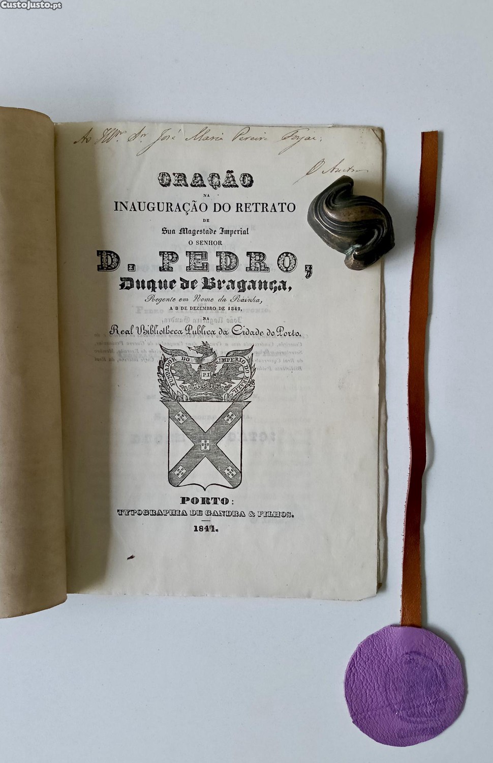 GANDRA (João Nogueira). - ORAÇÃO NA INAUGURAÇÃO DO RETRATO DE D. PEDRO, Duque de Bragança, Regente em None da Rainha, A 3 de Dezembro de 1842, na Real Bibliotheca Publica da Cidade do Porto.Porto, Typ. de Gandra & Filhos, 1847. In-8° 28 pp. Capa frágil e solta.