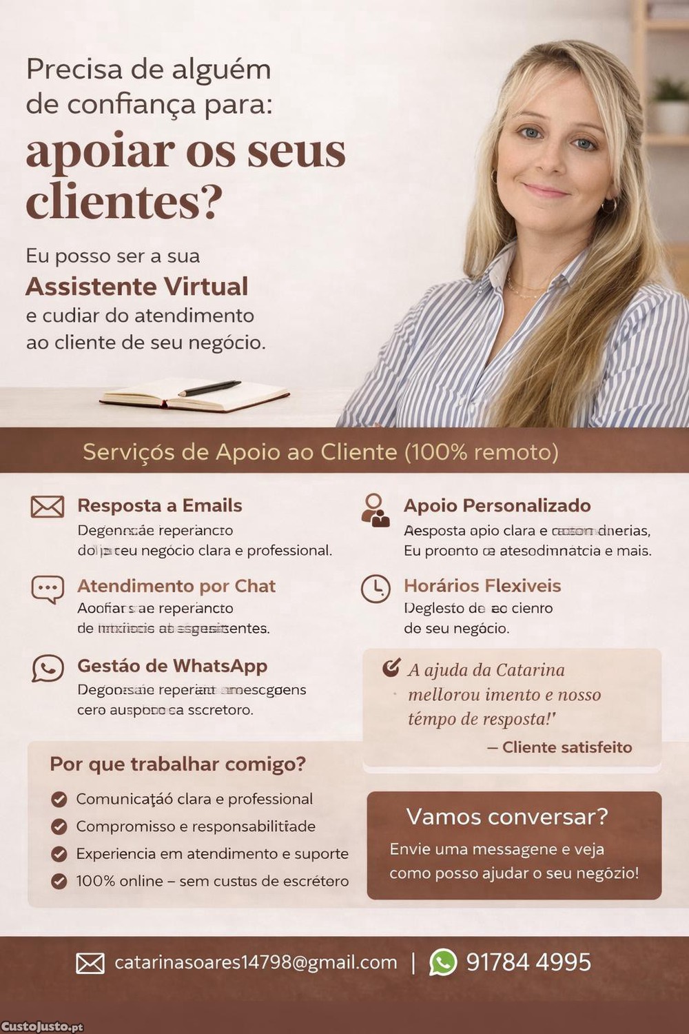 Eu ajudo empresas a melhorar o atendimento ao cliente, garantindo respostas rápidas, profissionais e organizadas.