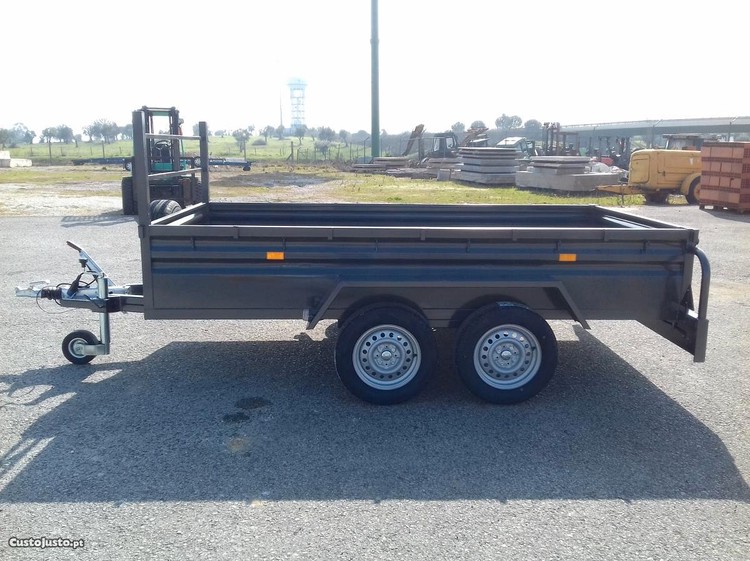 atrelado reboque de carga geral e diversa , com dois eixos de 1000 kg cada um , travão de inercia , travão de parque , 5 rodas novas jante 14 , taipal de abrir traseiro amovivel e cavalete amovível também , roda jockey , ifor travão de inercia e de parque .