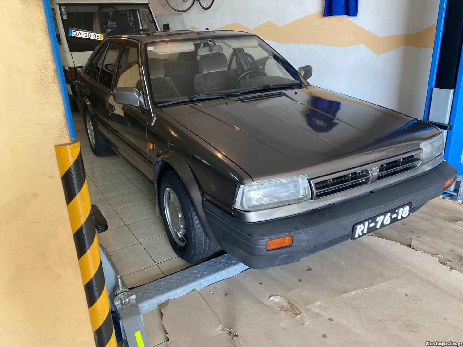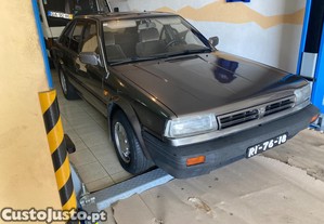 Automóvel clássico estacionado em garagem Trata-se de um Nissan 1.6 SLX, com matrícula portuguesa antiga .