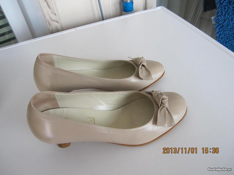 Par de sapatos semi novos, n. 37, bege, em pele e sola, salto comodo.