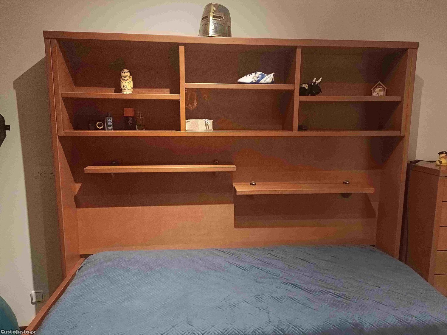 A parte da parede tem as prateleiras que permitem diferentes posições de arrumação. A cama de baixo aberta fica da mesma altura da outra, mas nunca foi usada.