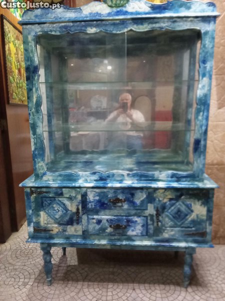 Cristaleira Queen Anne recuperada, pintada em tons azuis e branco. Base duas gavetas e duas portas. Puxadores metálicos. Parte superior 2 prateleiras em vidro, portas de correr em vidro. Altura máxima 1.70 Cm. Largura máxima 1.10 Cm Fundo máximo 40 Cm. Preço 150 Euros.