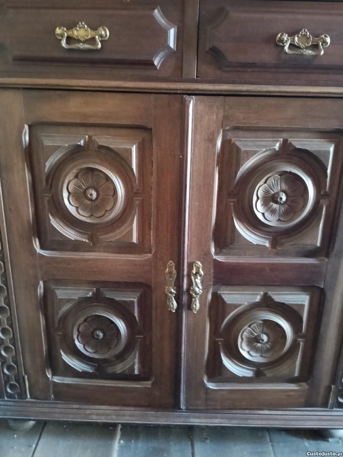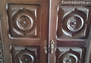 Este móvel de aparência elegante é um aparador antigo em madeira maciça, com detalhes decorativos esculpidos nas portas. Apesar de usado, mantém-se em bom estado de conservação e pode ser uma ótima adição a uma sala de estar ou sala de jantar com um estilo mais clássico.