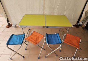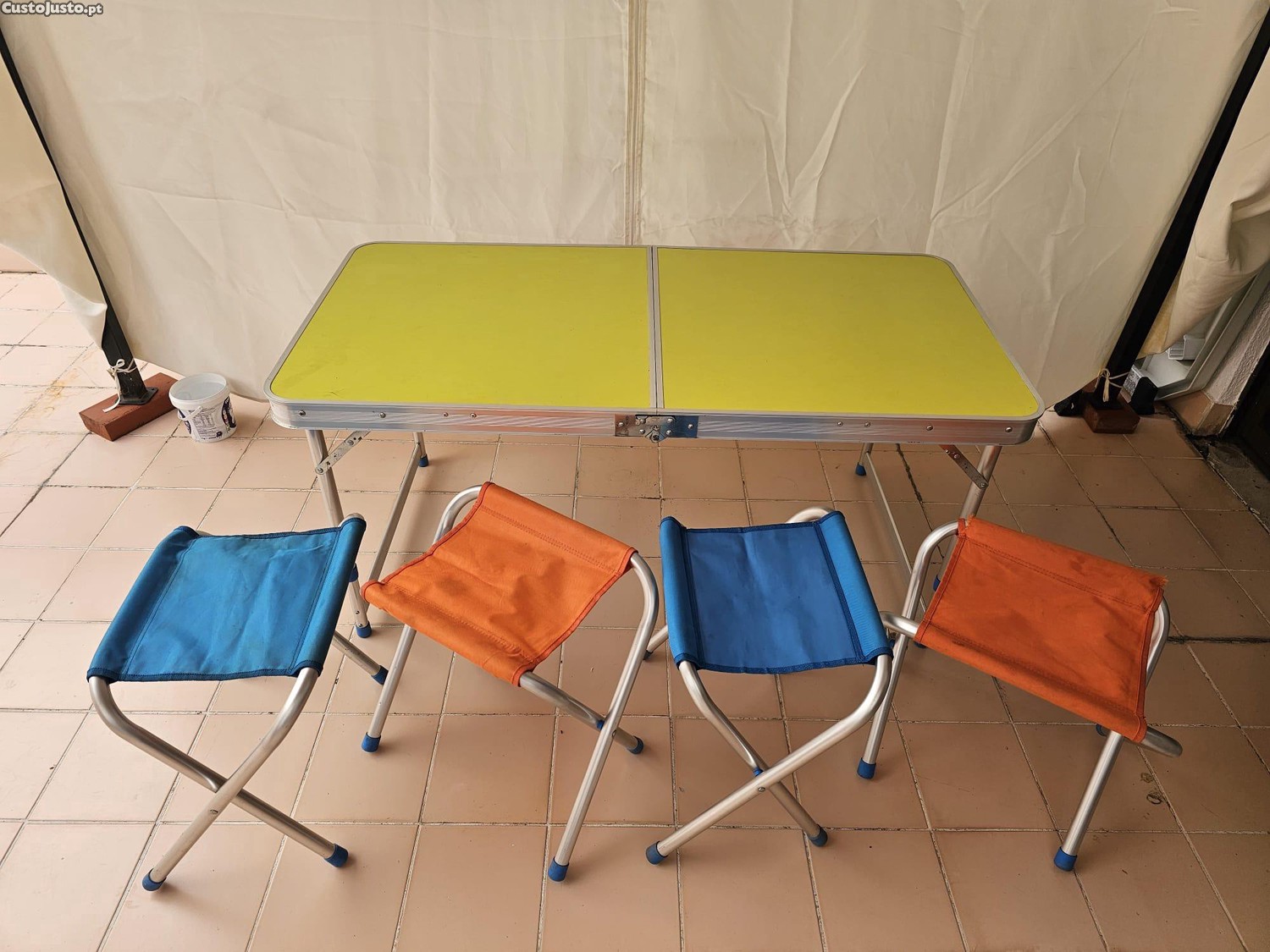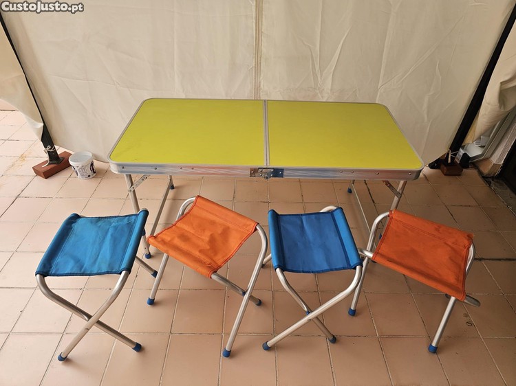 Mesa de piquenique dobrável e resistente, com tampo amarelo e estrutura de alumínio. Acompanha quatro cadeiras dobráveis em cores vivas, perfeitas para desfrutar de refeições ao ar livre com amigos e família. Este conjunto usado 3-4 vezes, está em otimo estado de conservação e pronto para novas aventuras.