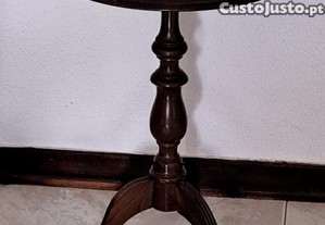 Mesa pé de galo, com três pés, com tampo redondo, em tom escuro.