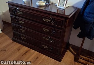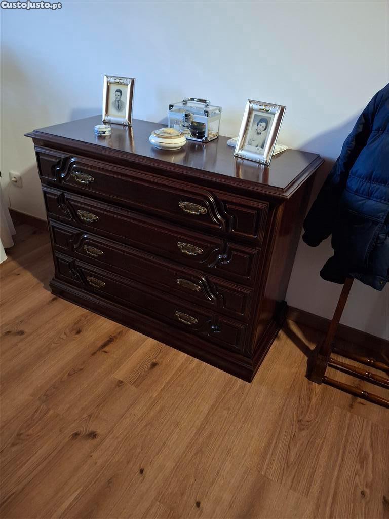 Mobília de madeira escura com cama de casal (inclui estrado e colchão), duas mesas de cabeceira, roupeiro e camiseiro, em muito bom estado de conservação. Transporte a cargo do comprador