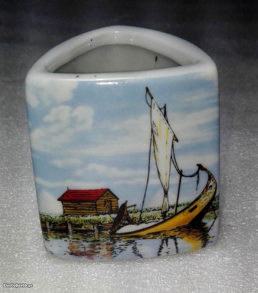 Peça em porcelana aluziva á cidade de Aveiro, com decoração de um moliceiro na ria