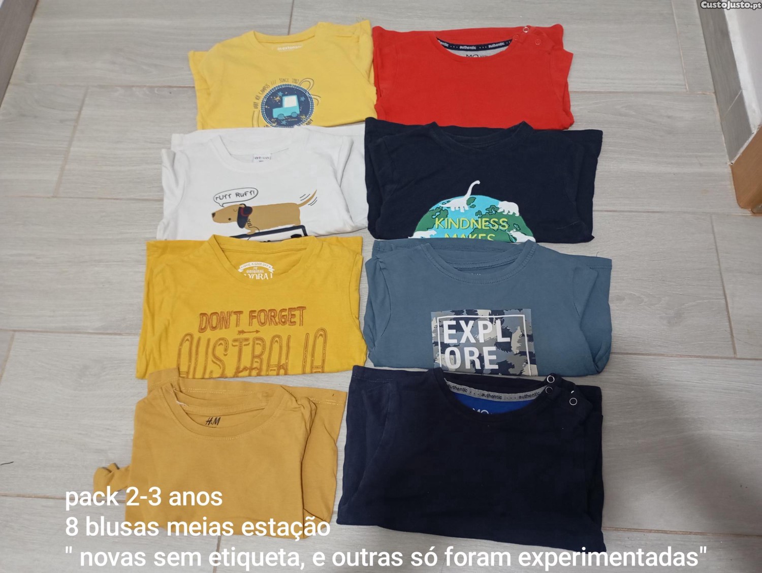 Pack de 8 t-shirts de meia estação para menino, tamanho 2-3 anos, em ótimo estado. Algumas peças novas sem etiqueta, outras apenas experimentadas.