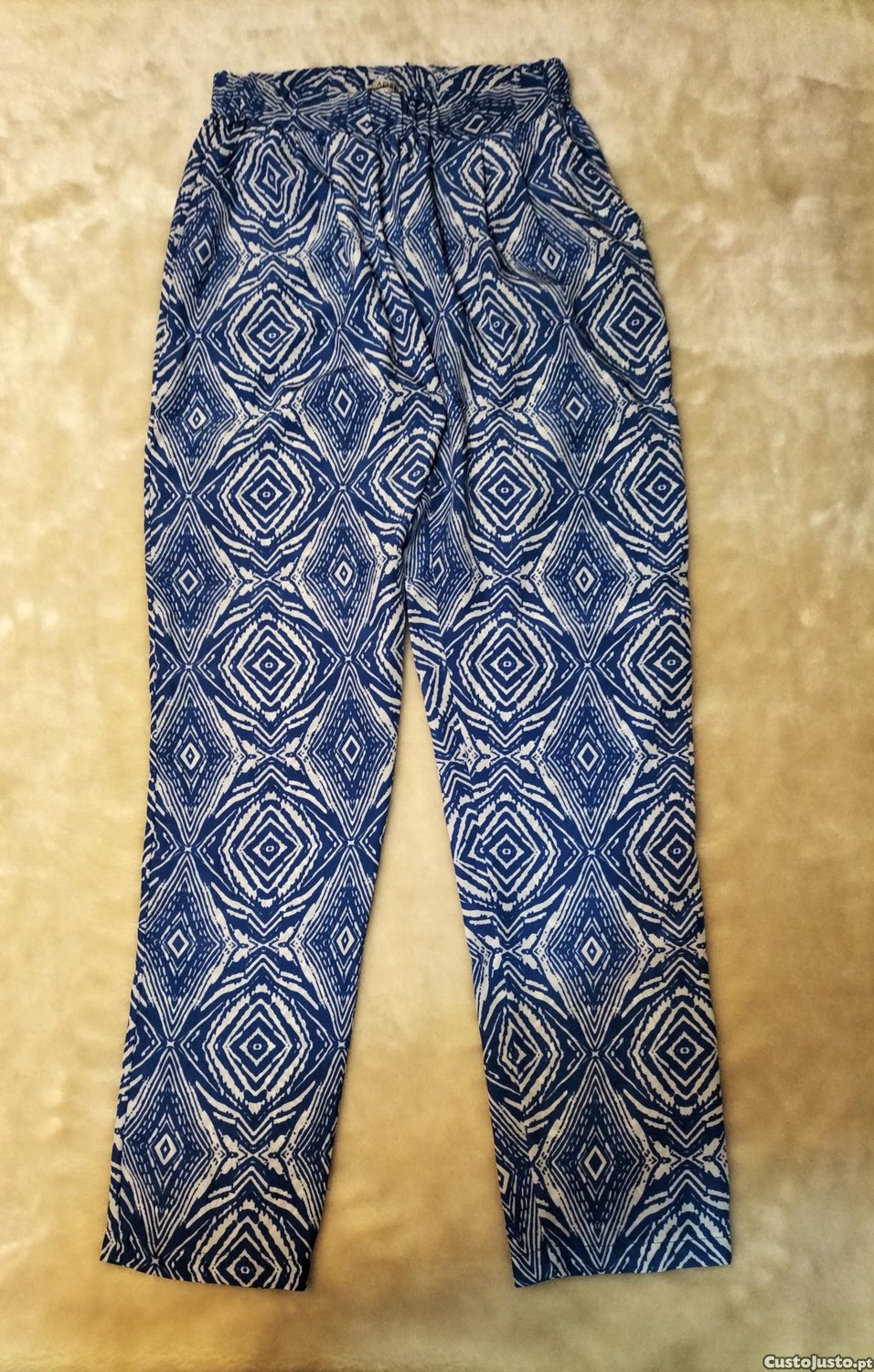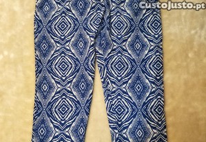 Vendo calças com padrão azul e branco, tamanho 38, poliéster, Cadena, em excelente estado. Sedosas, muito leves e frescas para o verão.