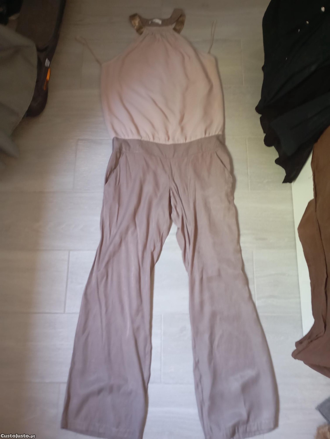 Macacão de senhora em tom nude/rosa claro, ideal para ocasiões especiais ou uso casual elegante.