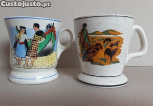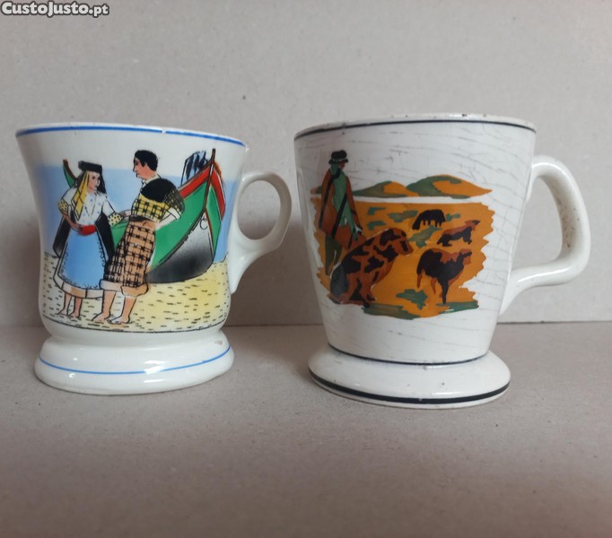 Duas giríssimas Canecas em faiança, Cesol e Aleluia. Cesol com " Recordação da Costa da Caparica ", Aleluia com " Lembrança de Oliveira de Frades". Ambas com imperfeições ( lascas) mais ao nível do bordo interno ( ver fotos sff). A da Aleluia com veios de pigmentação. Apesar de, estão muito bonitas.