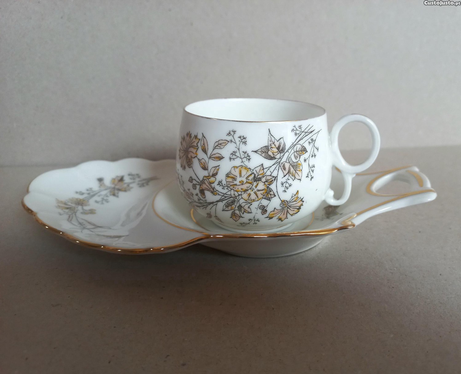 Chávena de Chá com pires em porcelana de Limoges. O pires tem uma cavidade específica para fixar a chávena ficando a lateral livre para servir bolachas ou pequenos sanduíches.