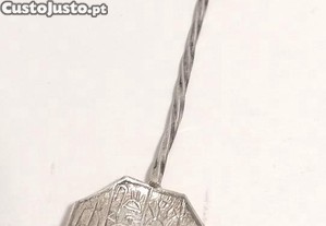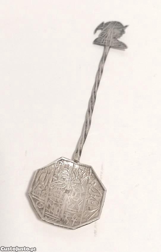 Colher decorativa com motivos egípcios. Metalizada.Tem motivo de cabeça de faraó e hieroglifos. Em bom estado. Aproximadamente 9,5 cms de comprimento.