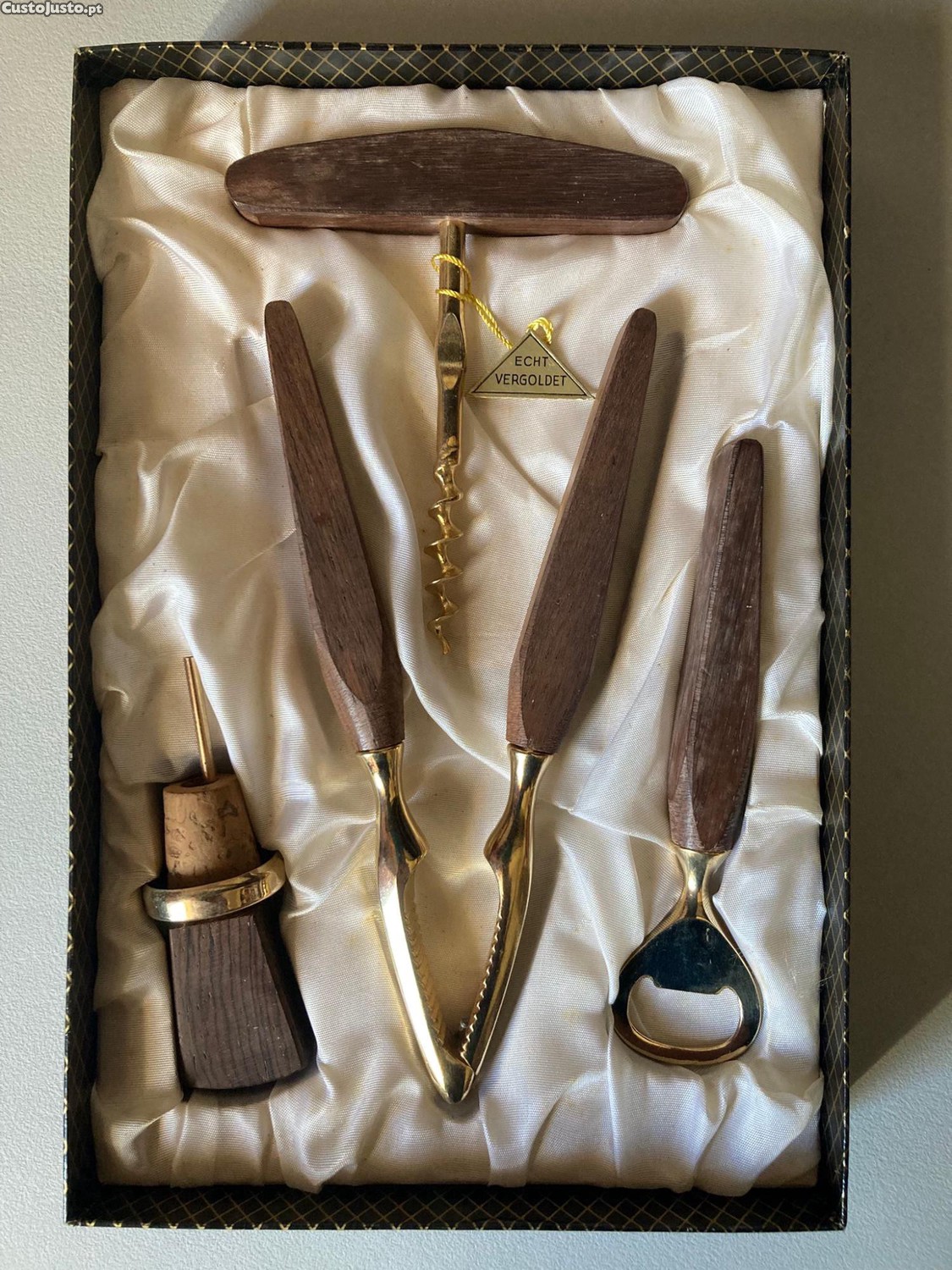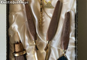 Conjunto composto por saca-rolhas, saca-caricas, quebra-nozes e rolha.