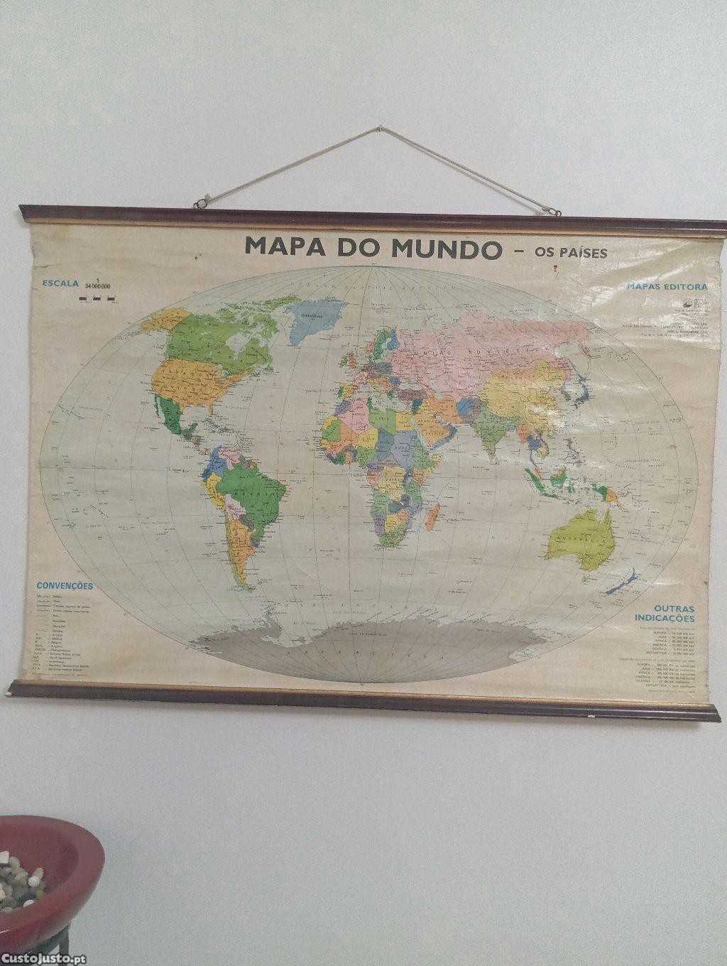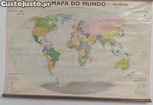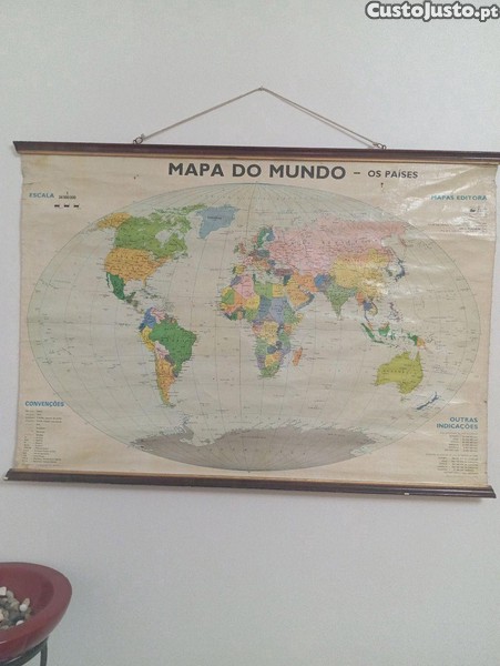 Mapa Mundo da Porto Editora da década 60 feito em papel reforçado e tecido com suporte em madeira medidas 1M x 70Cm para salas de estudo