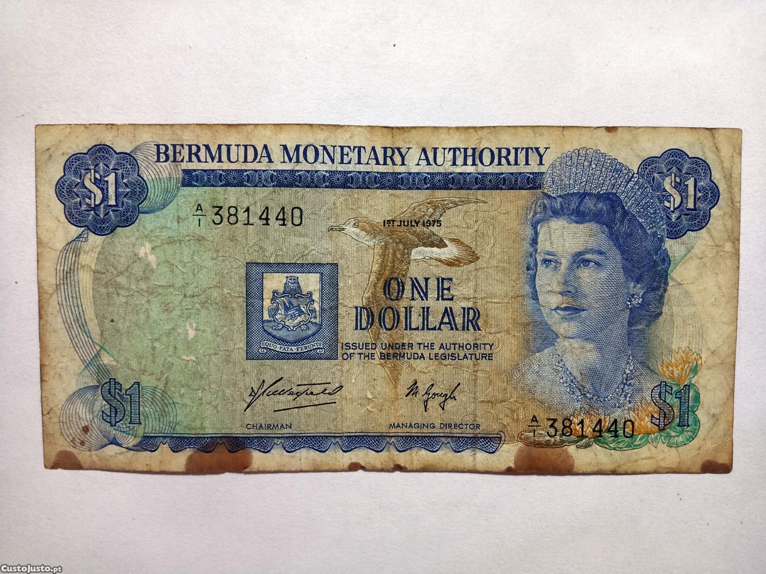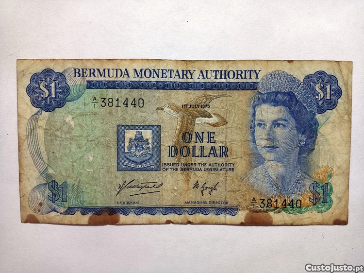 1 dollar de 1975 das ilhas Bermudas nota circulada no estado que as fotos demonstram