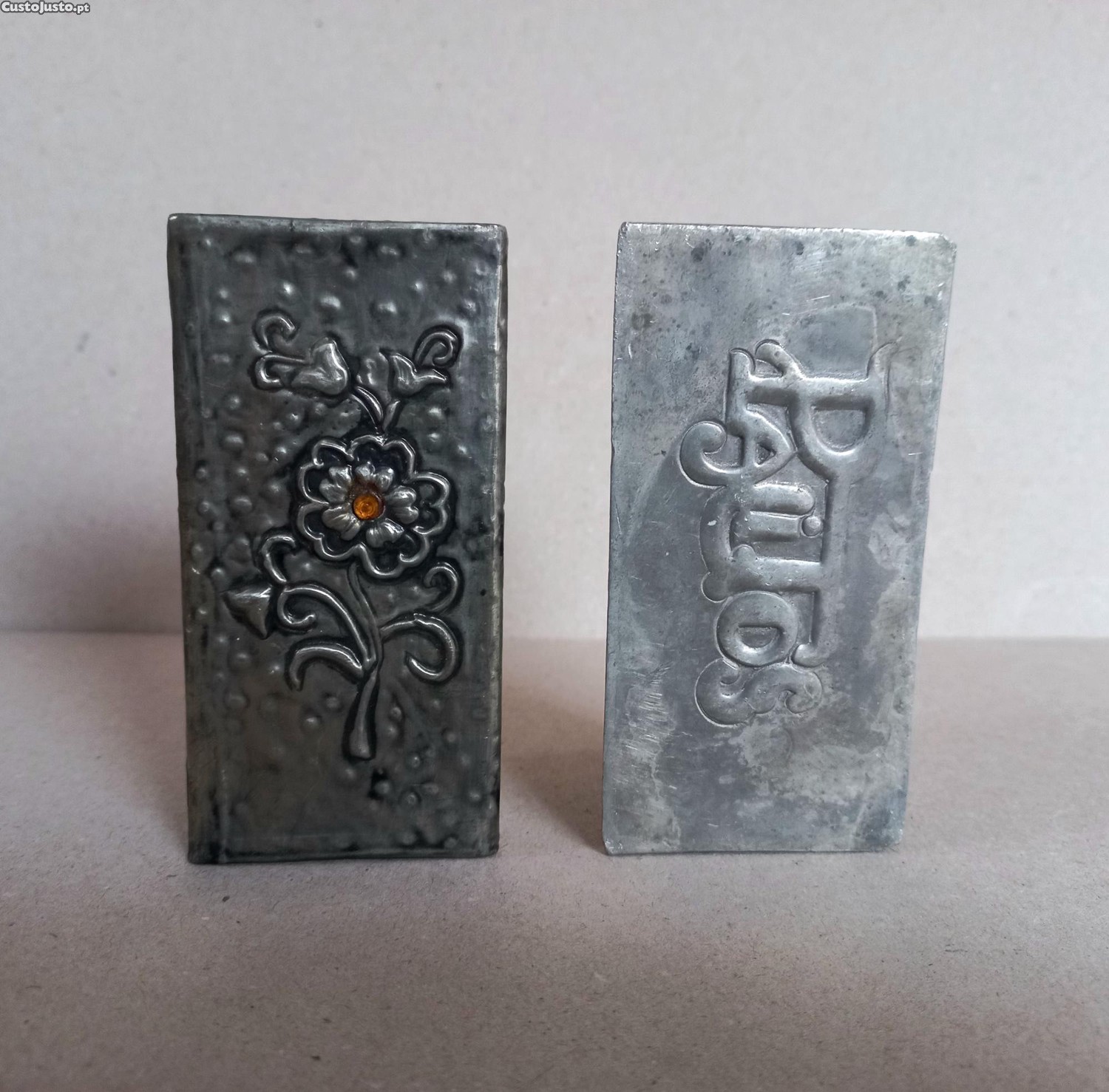 Dois Paliteiros, um em Estanho 98% puro e o outro em metal, este último com decoração floral relevada em duas faces e pedrinha de cor Âmbar no centro da flor. Bom estado. 10,2 cm altura