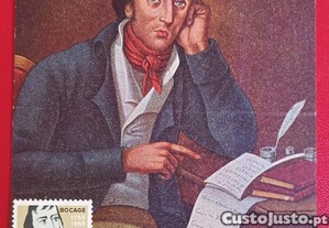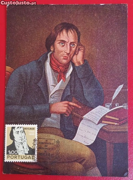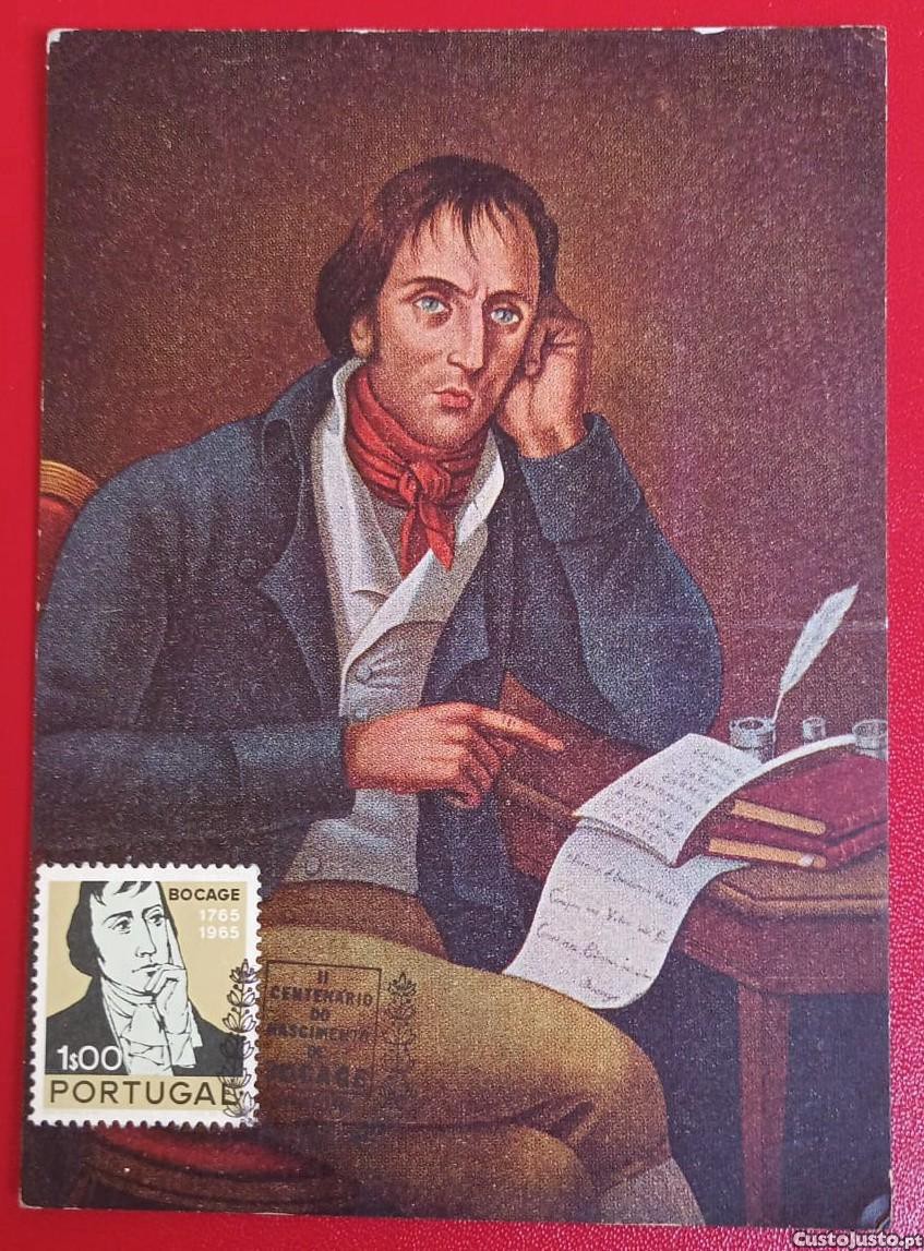 Postal comemorativa do II Centenário do Nascimento de Bocage. A imagem retrata o poeta em pose pensativa, com uma pena e tinteiro à sua frente.