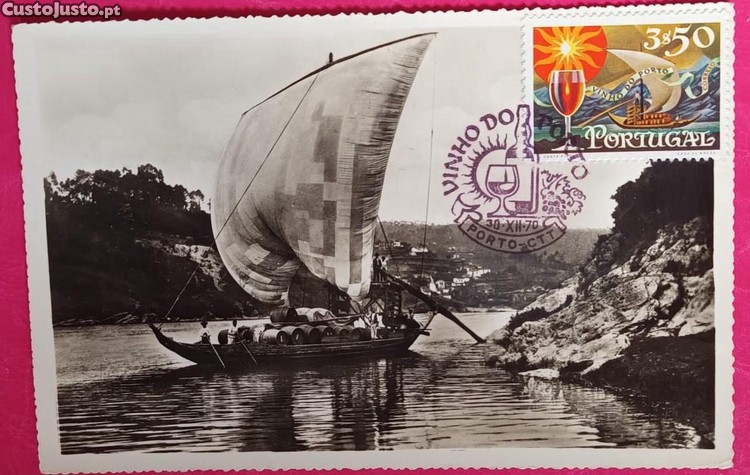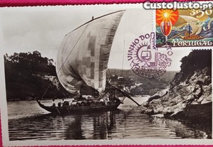 Postal antigo com a imagem de um barco rabelo no Rio Douro, transportando pipas de vinho. Inclui um selo comemorativo.