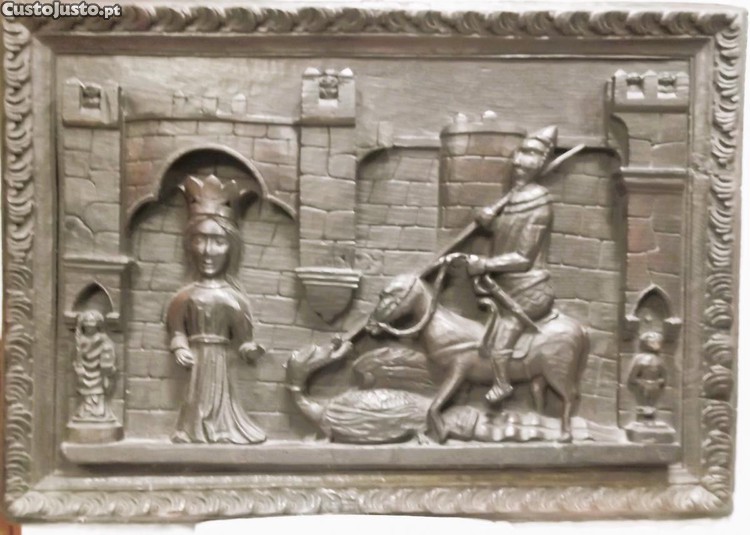 Retábulo em madeira o combate de S. Jorge com o dragão, século XIV, enquadrado por muralhas, coroadas por ameias de onde assomam pequenas cabeças de figurantes que assistem à luta épica O tema surge complementado, à esquerda, por Santa Bárbara e, à direita, por S. Sebastião, inseridos em edículas, escavadas nas torres das muralhas. Esta peça tem mais de 100 anos Medidas: Altura 60 Cm. comprimento 85 Cm. espessura máxima 8 Cm. peso 11 Kg. Peça digna de qualquer grande coleção e conhecedores de arte. Preço 1500 Euros