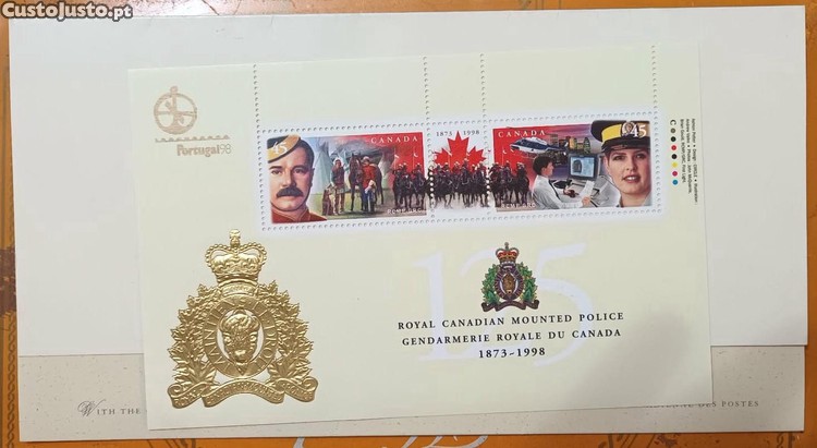 Conjunto de selos comemorativos do Canadá, celebrando a Royal Canadian Mounted Police (Gendarmaria Real do Canadá) de 1873-1998. Inclui um emblema dourado da RCMP.